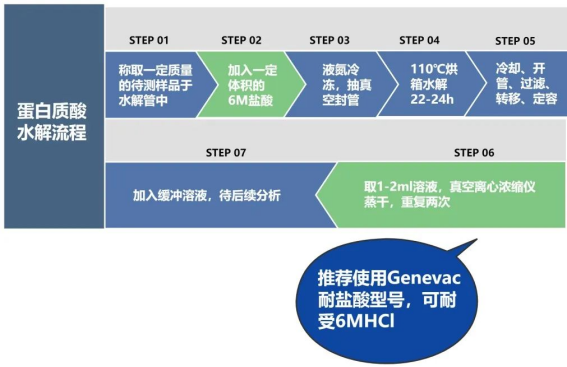 酸水解法是氨基酸分析中较常用的前处理方法, 22种α-氨基酸中大多数可采用酸水解法,即用6M高纯度的盐酸将蛋白质裂解成单个游离氨基酸,随后把残留的盐酸蒸发去除。