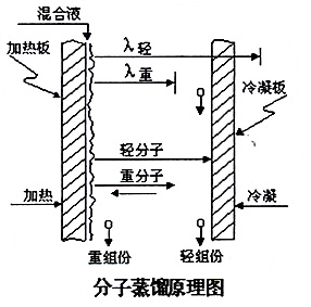 把分子连续两次碰撞之间通过的路程称为自由程,分子自由程的平均值称为分子平均自由程。由分子的平均自由程公式可知,不同物质分子由于运动速度和有效分子直径不同,平均分子自由程也不相同,重分子的平均自由程小,轻分子的平均自由程大。在液面上方小于轻分子平均自由程而大于重分子平均自由程处设置冷凝面,使得轻分子不断地落在冷凝面上被冷凝,进而破坏轻分子的动态平衡,而重分子因为到达不了冷凝面就会发生碰撞返回溶液中,最终使混合液中的不同成分分离。如下图所示:
