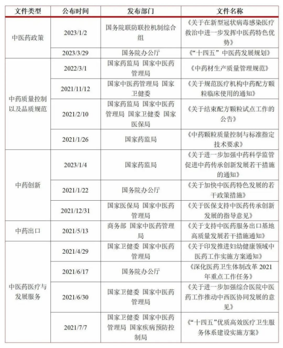 因此,尽管在1月8日,国家对新型冠状病毒感染已由”防感染”转向实施“乙类乙管”,中医药仍然将在接下来的“保健康、防重症”阶段扮演重要角色。不仅如此,我国对于中医药其实一直保持着相对的关注,这一点从2021-2023年一系列的支持政策也可以看到。