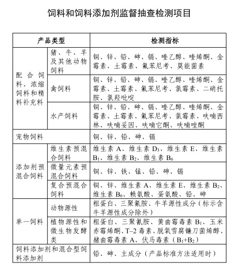 例行监测项目包括铜、锌、真菌毒素、兽药、非法添加物及其他风险因子等指标。根据历年饲料质量安全监管工作中发现的新风险因子、饲料质量安全案件查处发现的问题,以及举报线索等方面情况,结合现有检测方法基础,对不同类型饲料和饲料添加剂产品针对性地设置不同监测项目。