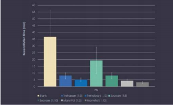虽然冻干蛋糕的优雅性相似,但通过添加冻干?;ぜ?,大大减少了重构时间。在PNs中,甘露醇 (1:5和1:10) 将这次时间从35分钟减少到5 min以下 (图1)