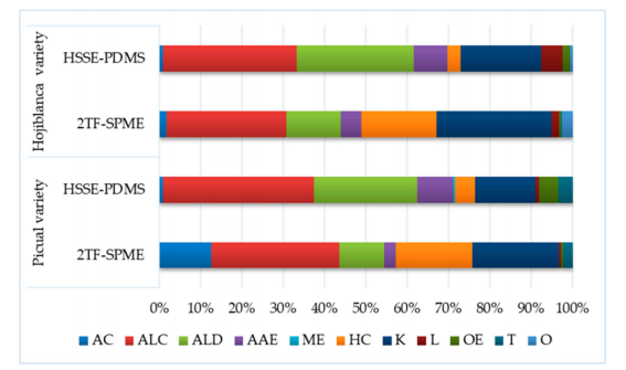 图2:通过HSSE-PDMS和2TF-SPME获得的EVOO Picual和Hojiblanca品种主要化学基团的总峰面积值的百分比